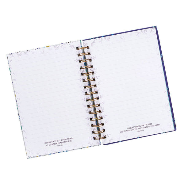 This beautifully designed journal is embellished with purple foiled text that boldly displays Scripture from Philippians 4:13, "I can do all this through Him who gives me strength.” This hardcover journal is handy for note taking during quiet time because the wire binding makes the covers fold all the way around, providing a good surface to write on. It’s both beautiful and functional and makes a marvelous addition to your quiet moments of journaling.